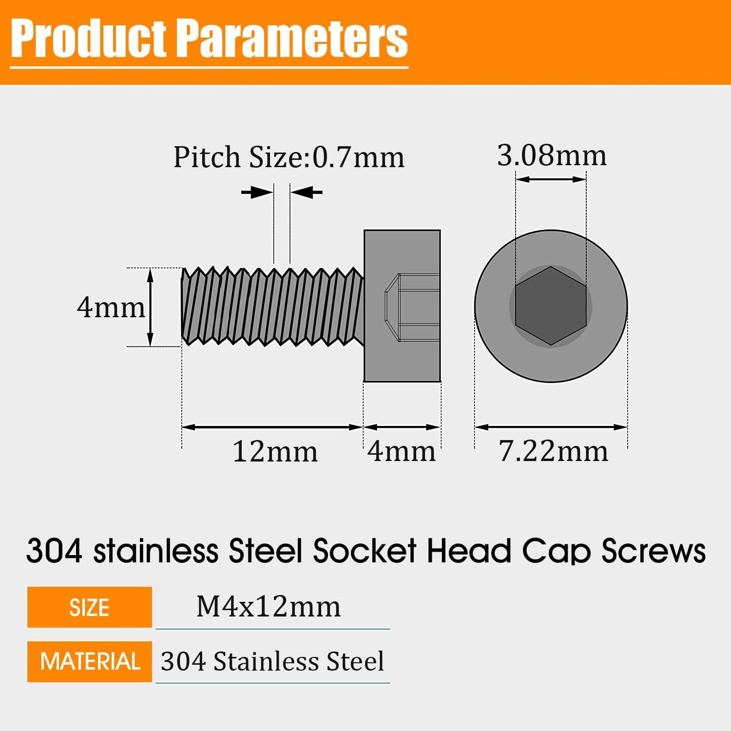 M4 x 12mm Socket Head Cap Screws are premium-quality machine fasteners made from 304 stainless steel, offering excellent corrosion resistance, strength, and durability. These screws feature a hex Allen socket drive that allows precise tightening and a secure fit, even in high-vibration applications.The fully threaded design ensures strong holding power and reliable performance in metal, plastic, and mechanical assemblies. A smooth bright finish enhances appearance while providing additional protection against rust and wear, making these screws suitable for both indoor and outdoor use.These M4 x 12mm Allen bolts are widely used in electronics, machinery, furniture assembly, automotive components, 3D printers, DIY projects, and general maintenance work. Designed for accuracy and long service life, they are an ideal choice for professionals, technicians, and hobbyists.If you are looking for reliable, rust-resistant, and high-performance machine thread fasteners, this 10-piece pack of M4 x 12mm socket head cap screws is a dependable solution.